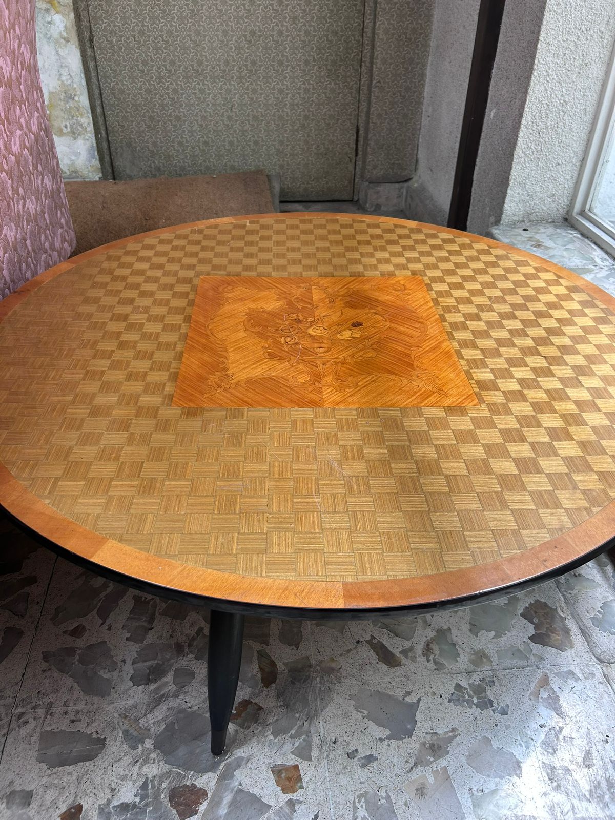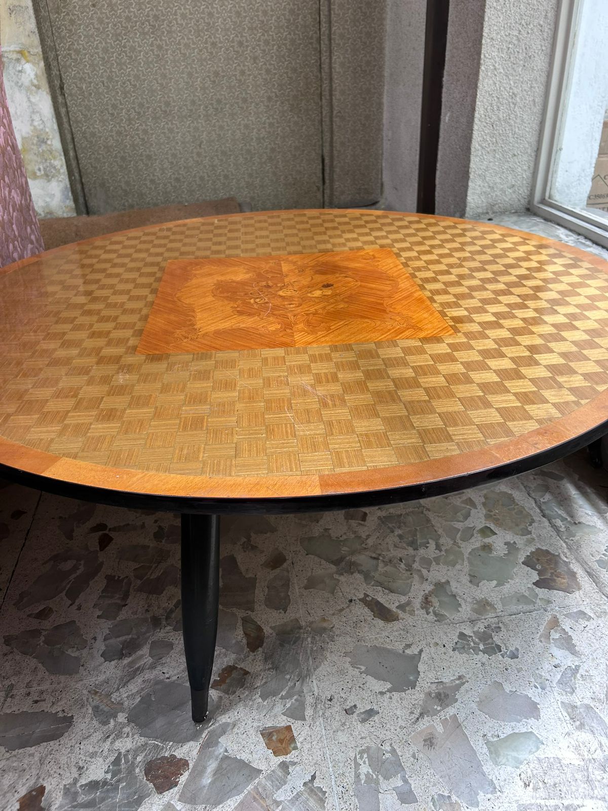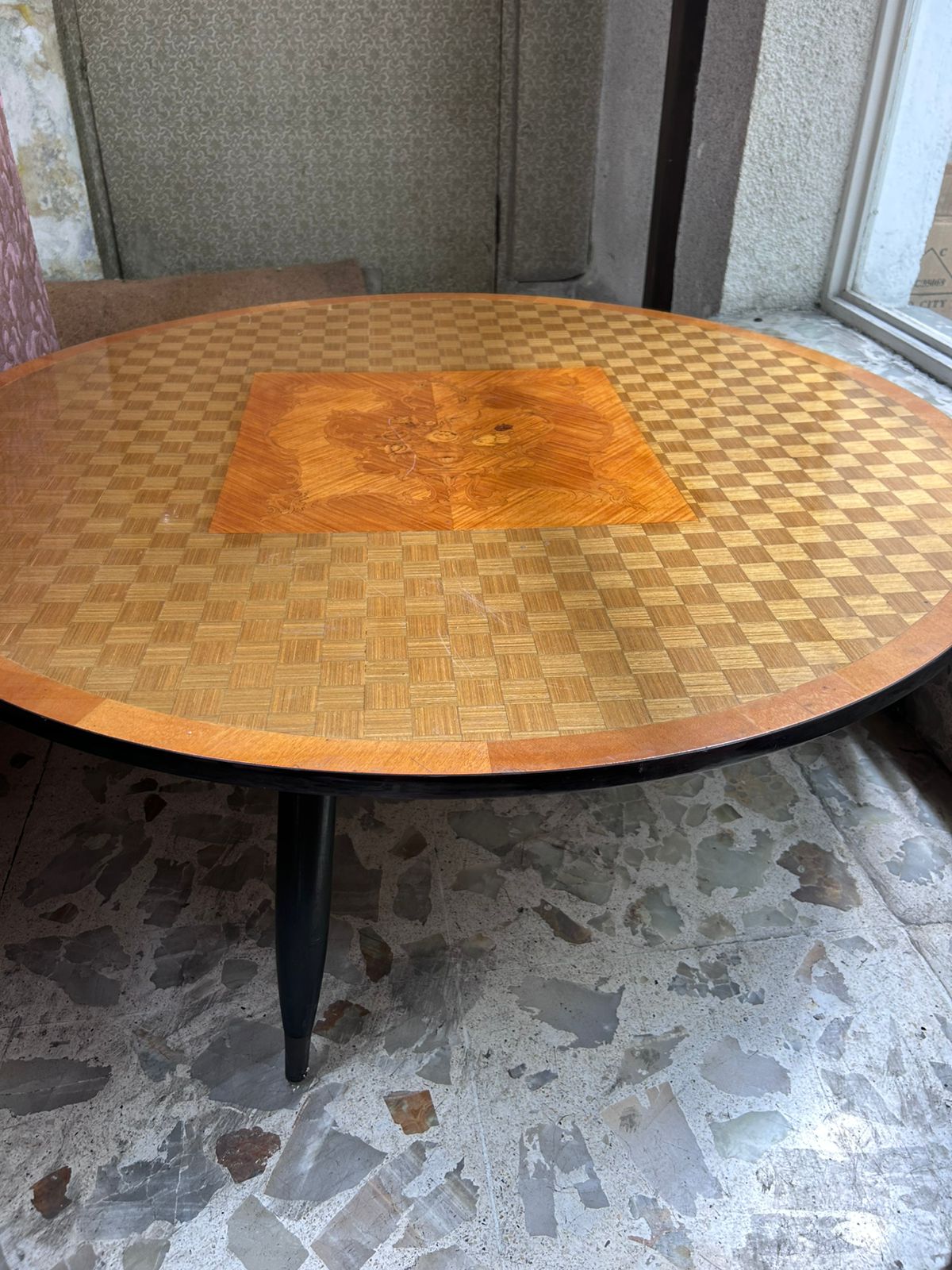 • Cubierta: Marquetería geométrica enchapada con incrustaciones centrales tipo parquet (posiblemente nogal o maple)